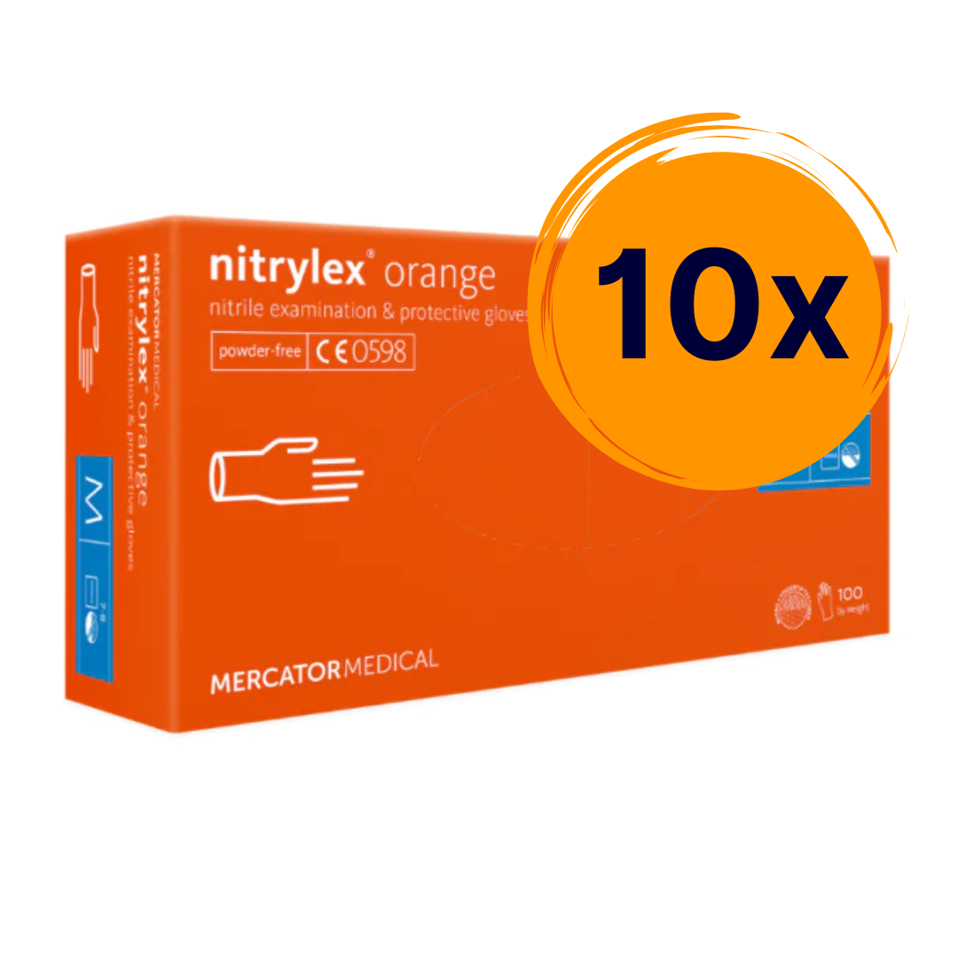10 doboz Nitrylex® Orange latexmentes, púdermentes nitril kesztyű élénk narancs színben.
