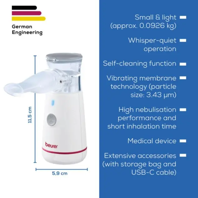 A Beurer IH 47 egy modern rezgőmembrános (mesh) inhalátor, amely előnye a halk működés, gyors belégzési hatás és kompakt kialakítás. A készülék képes felső és alsó légutak kezelhetőségére is, miközben kényelmes és hordozható dizájnnal segíti a mindennapi használatot. Az öntisztító funkció minimalizálja a karbantartási igényt, míg az USB-C csatlakozó lehetővé teszi az egyszerű töltést.